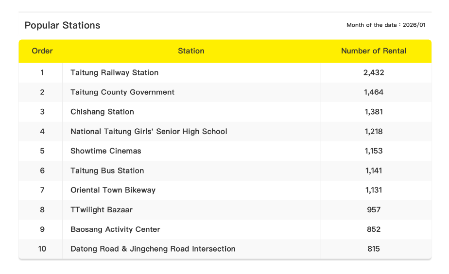 Due to Taitung’s lengthy array of roads and the scorching heat of summer, the Taitung County Government’s contract for 1,200 YouBikes stipulates that half of them are to be pedal-assisted e-bikes, so cycling is much easier and thus more pleasant, even up hills and for long distances. The data shows that the train station is the most popular YouBike rental spot, verifying the fact that, after getting off the train, many people use the bikes to get to accommodations and tourist spots that are “kind of but not really that far away.”